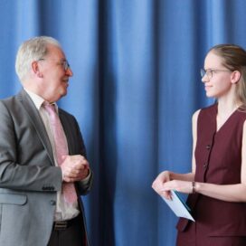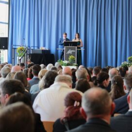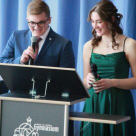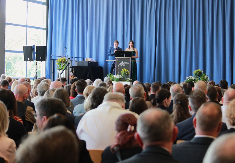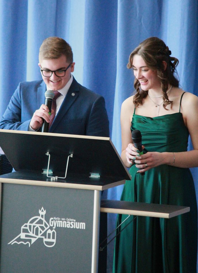 „Bacabi – Endlich ist es RUM!“ – zuerst einmal mag dies nach schwierigen Zeiten klingen. Doch Mia Weber und Felix Zundel, die für ihre Stufe die Rede der Absolventinnen und Absolventen hielten, betonten, dass es neben anstrengenden Phasen in ihrer Schullaufbahn vor allem die schönen „Momente mit viel herzlichem Lachen und Freude“ mit ihren Mitschülern am MvCG sind, die ihnen noch lange in Erinnerung bleiben werden. Die Stufe habe als Team viel geschafft und trotz mancher Stolpersteine durch Herzlichkeit, Verantwortung und Zusammenarbeit das lang ersehnte Ziel, nun endlich das Abiturzeugnis in den Händen zu halten und dies gebührend feiern zu können, erreicht. Dabei bedankten sie sich herzlich bei den vielen Menschen, die sie auf ihrem Weg während all der Jahre ihrer Schullaufbahn unterstützt hatten.